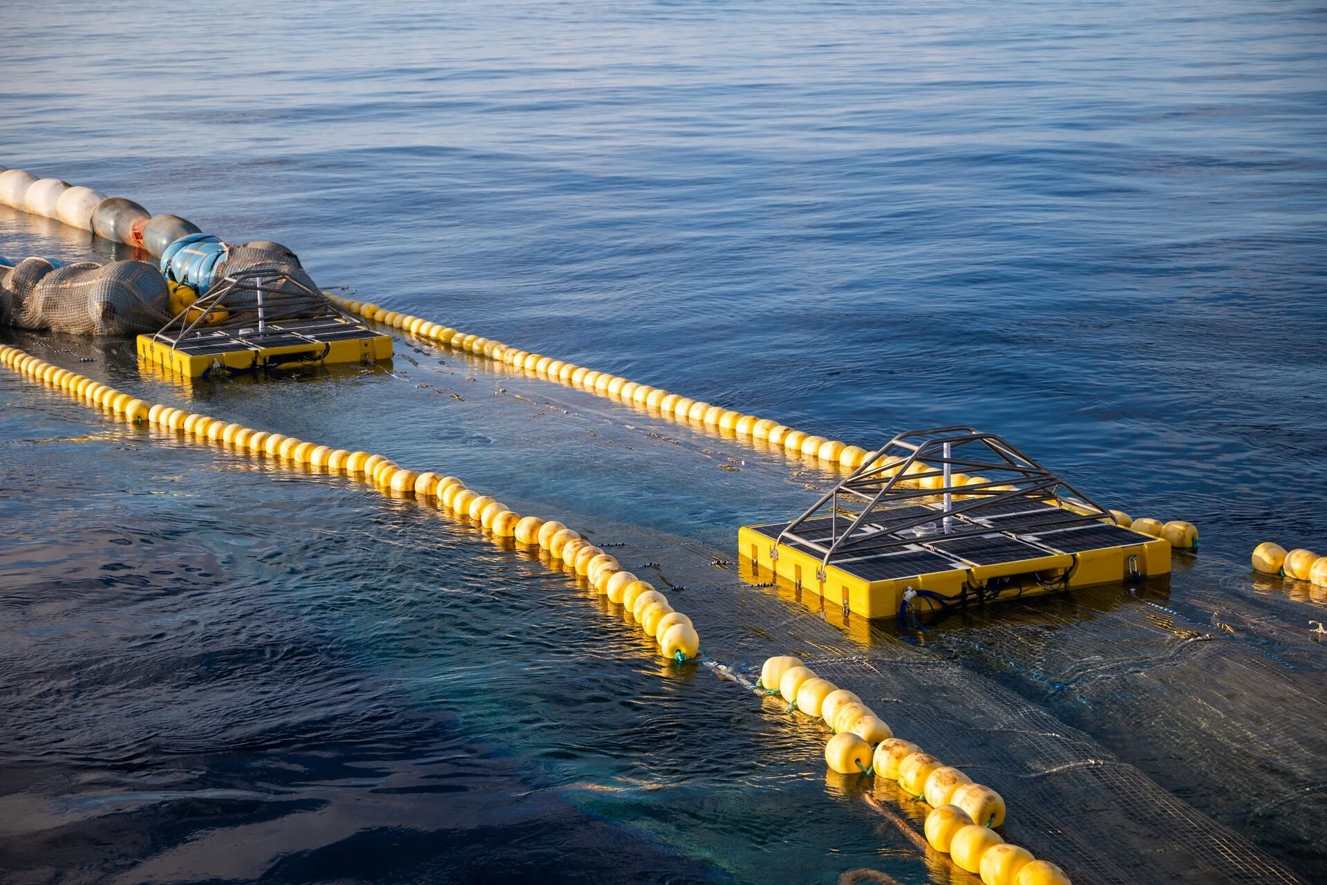 Floating buoy guiding ocean plastic into the Dutch cleanup system’s collection channel.